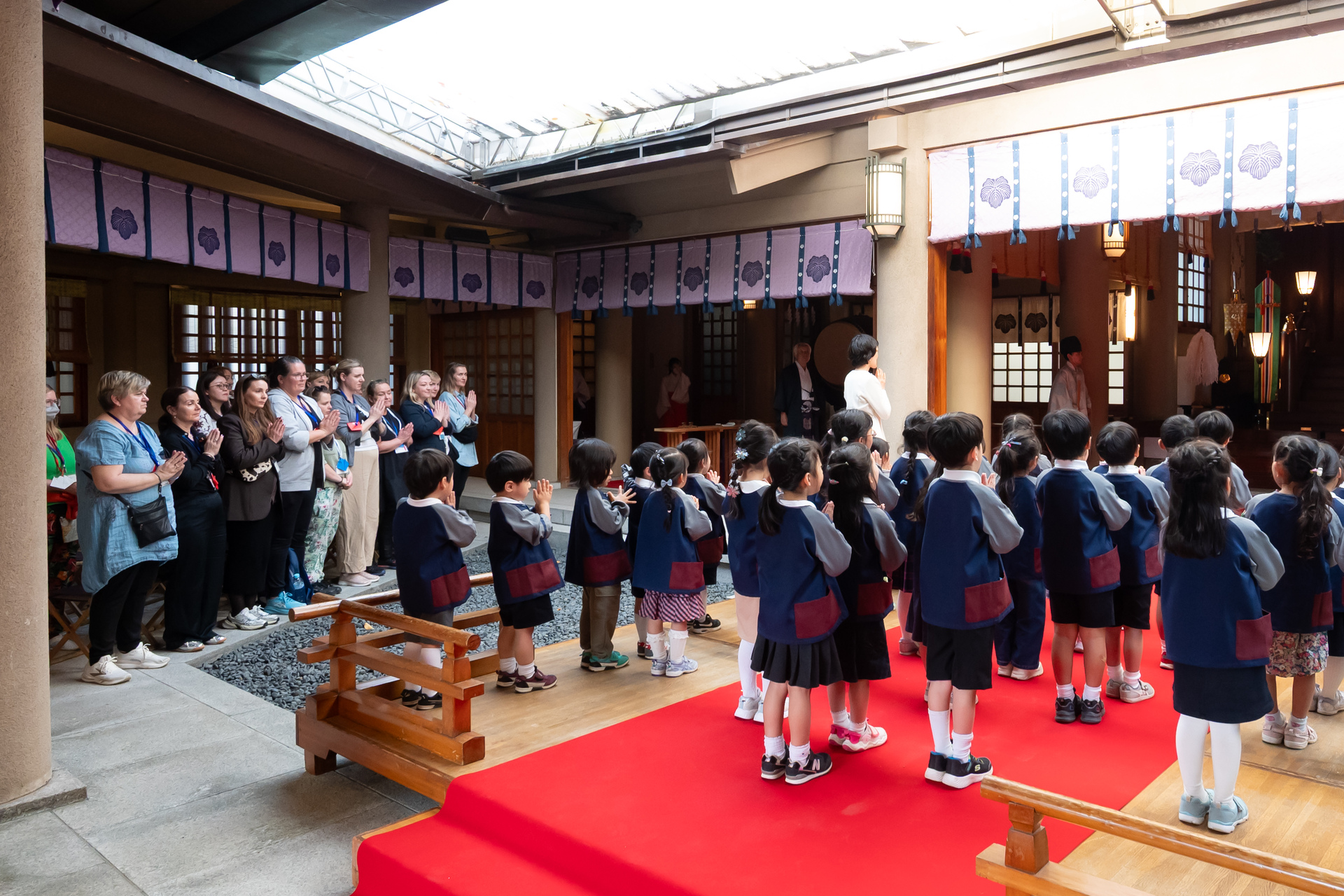 園庭でオセロゲームをし、神池で鯉の餌やり、最後は神社本殿で正式参拝をしました。